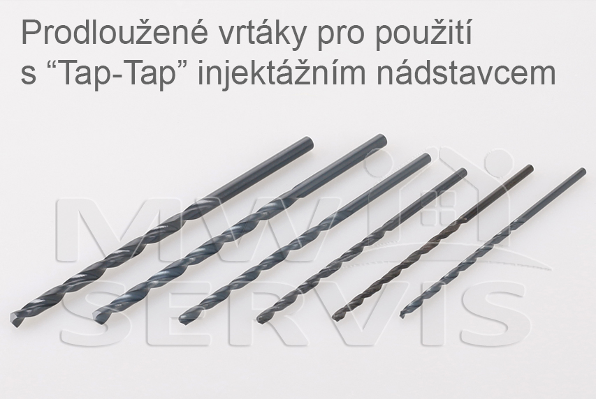 Univerzální prodloužený vrták do kovu i do dřeva o průměru 4,3mm a délce 126mm k vrtání otvorů pro tlakovou injektáž dřeva s použitím injektážního nástavce Tap-Tap s přípojnou tlak. hadicí nebo Tap-Tap s připojovacím závitem 7/8 pro AIRLESS pistole WAGNER aj. Tento vrták lze po opotřebení nabrousit.